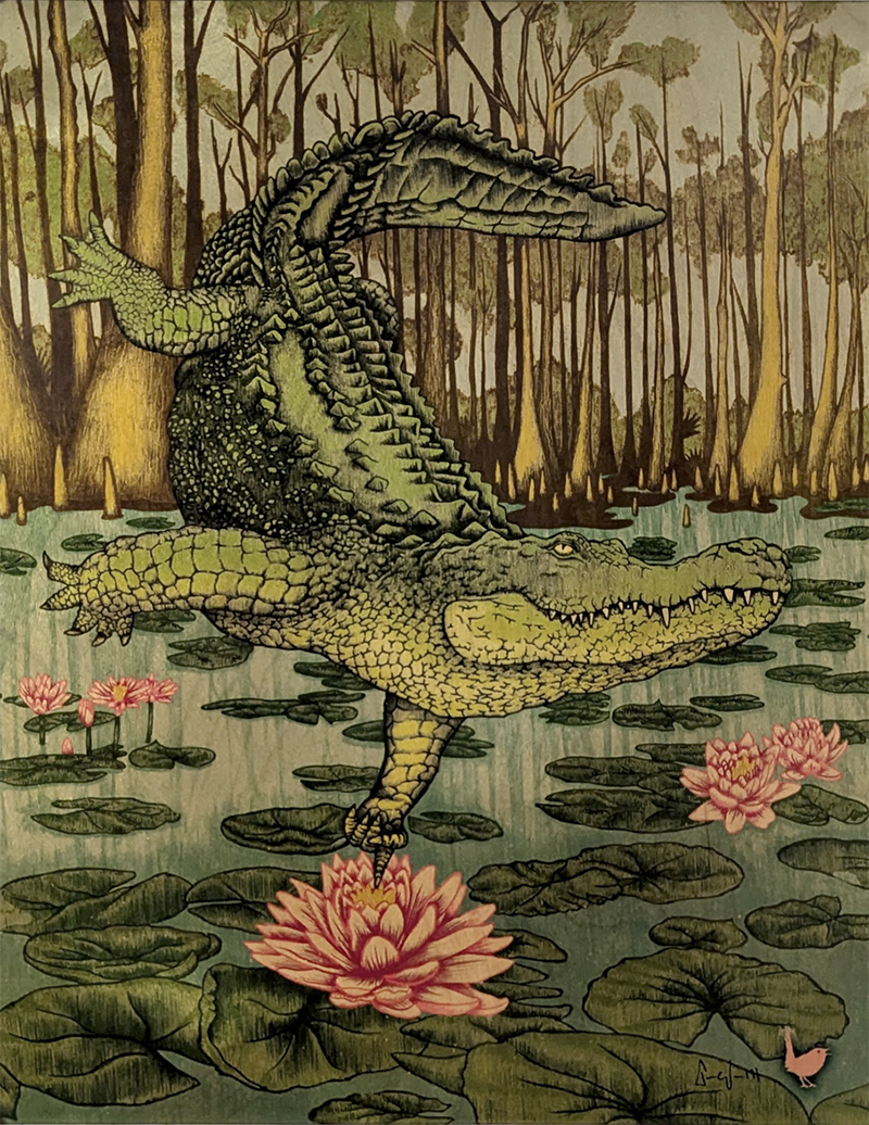 He has explored many artistic mediums over the years, but is most drawn to illustration, with a particular appreciation for printmaking. His process blends the two through a combination of digital and traditional techniques. He begins with a sketch in Photoshop, refines it with pencil using a light board, then scans the final drawing to add color digitally before transferring the image onto wood through sublimation printing.